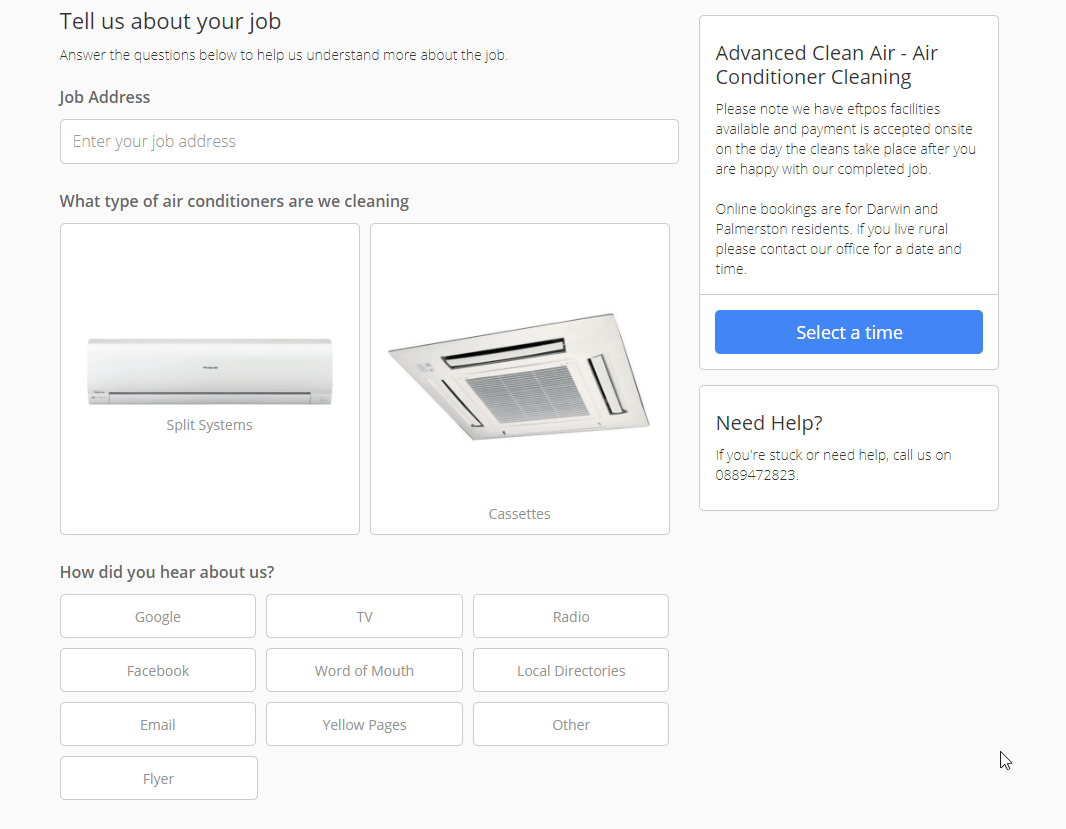 allows you to choose exactly what you want to get done. From there you are just a few clicks away from having a scheduled time and the final total cost of the works you have requested. No more filling in your details and waiting for a call back from the office. Just fill in your details and decide exactly what you want done from the options provided. You can then choose a time from all of our available times in real time. Once chosen you have scheduled your air-con cleaning appointment and will receive a confirmation email within moments.